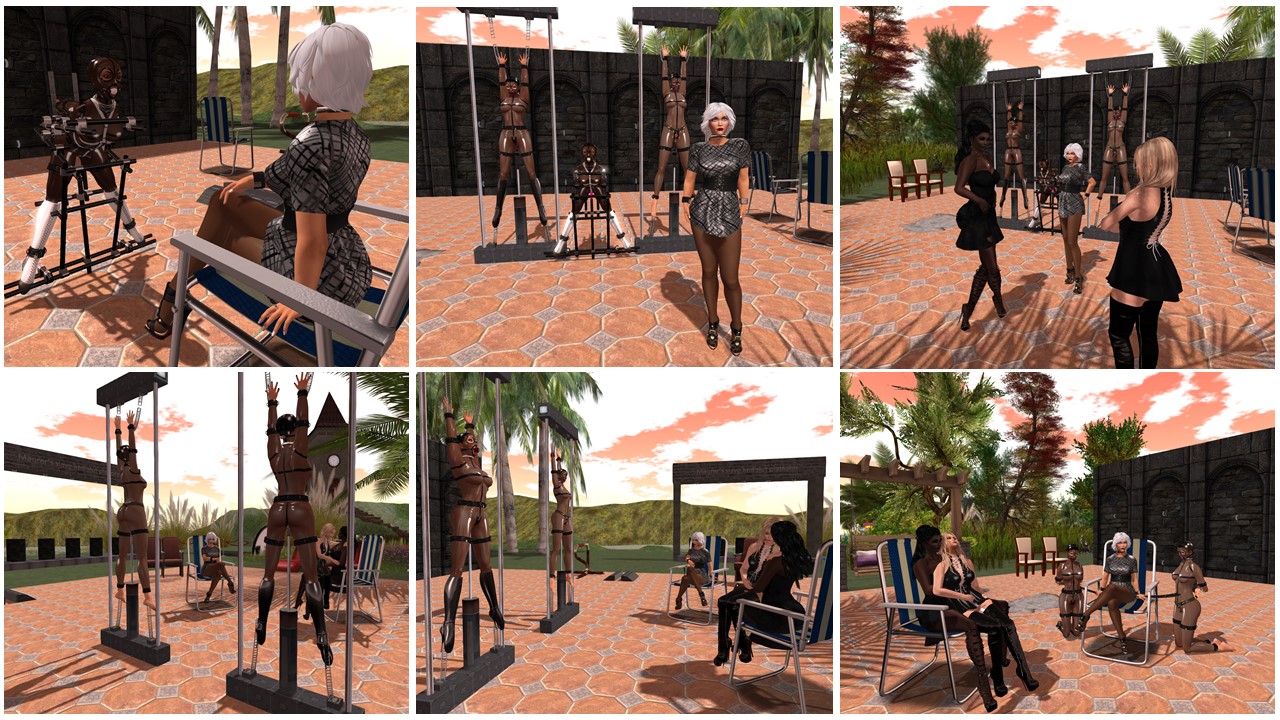 slave Adarra was inworld ad I decided to have a relaxing night at home. I put slave kelly and slave Adarra on two tubular boobular racks facing eachother at the Stonehaven patio and had fun playing with the remotes. Both slaves entertained me with their moans and begging and as I was in a generous mood bit slaves did cum for me.