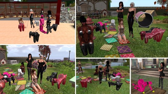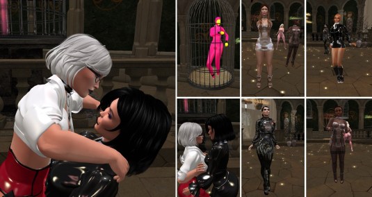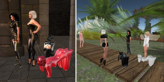 Last night we had our regular party at our homesim Mount Everest. It was relaxing and fun. We really enjoy to begin our weekends winding down dancing and chatting. We also had our living latex dolls slave Flo and slave Nina with us and we allowed them to dance and to share the fun. slave Flo wore sun glasses which look really cool in combination with the yellow latex suit.