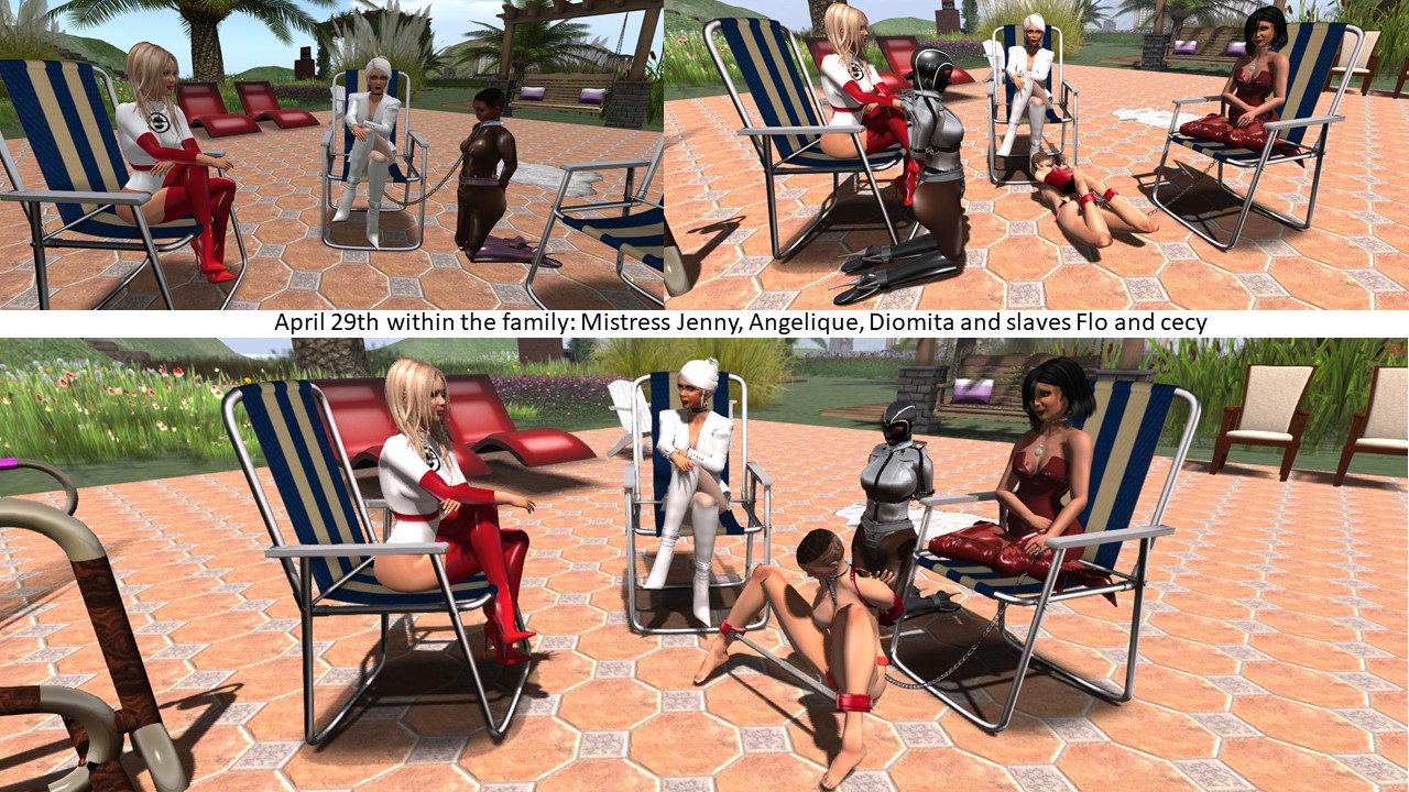 April 30th at the patio near our Stonehaven wall: Mistress Jenny and Diomita watching slave cecy licking slave Flo. (for those looking for details, I didn‘t find my glasses and took my green spare glasses instead)