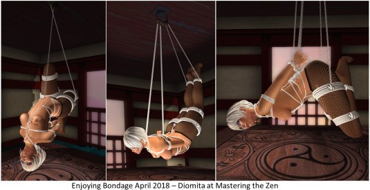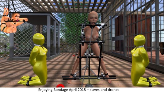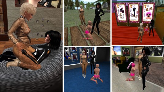 We own slave Flo “just” five years now. Time flies! slave Flo is enjoying bondage and restrictions, she developed her own status within the family and like Kitty she has become a friend, a fix part of our Second Life and we’re happy to own her. For her 6th year with us we agreed to keep her nicely tied up in different shiny outfits and hoods and gags and chains and mittens and ….