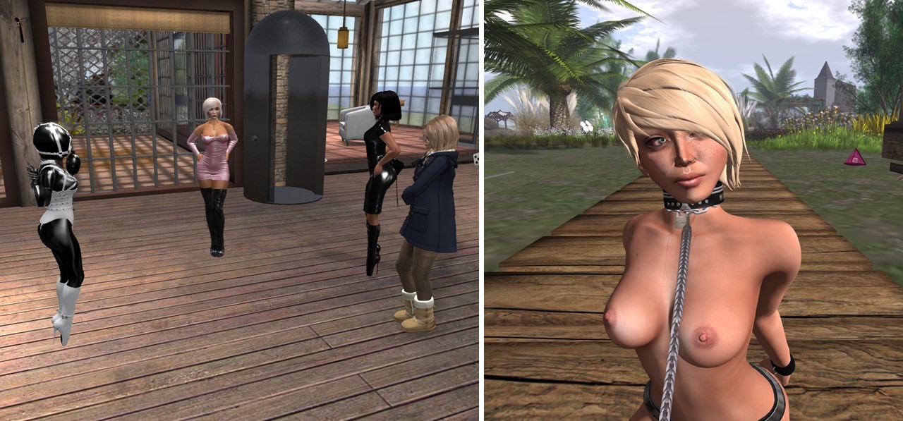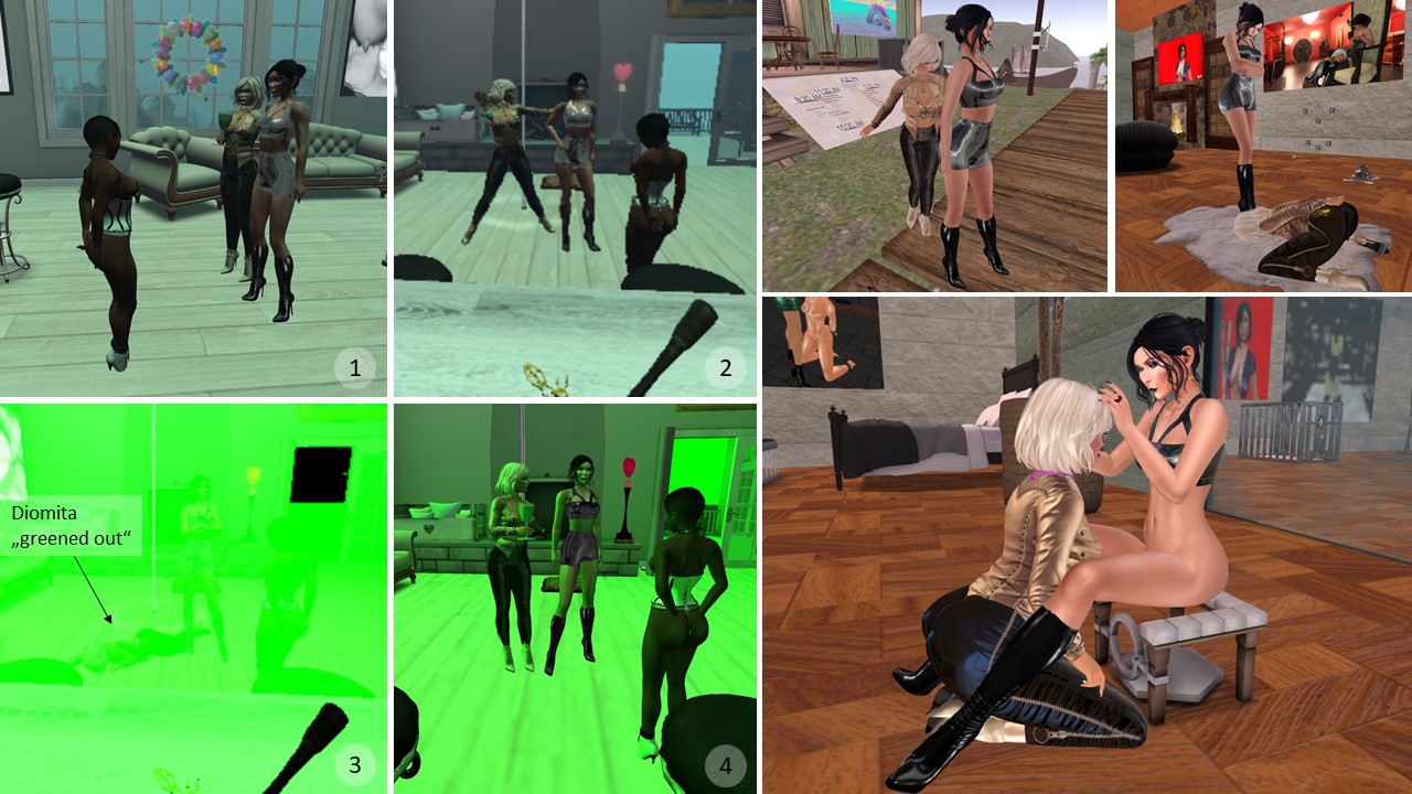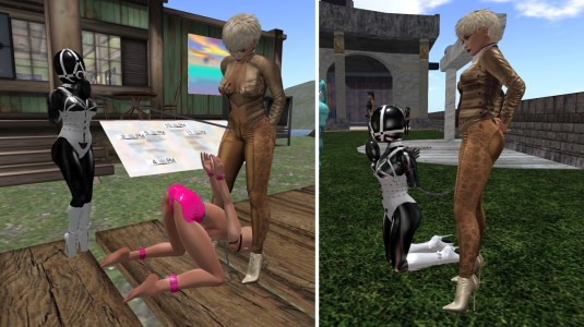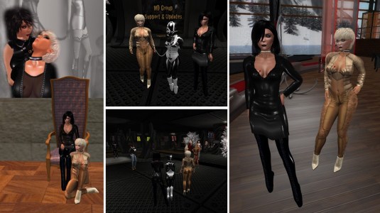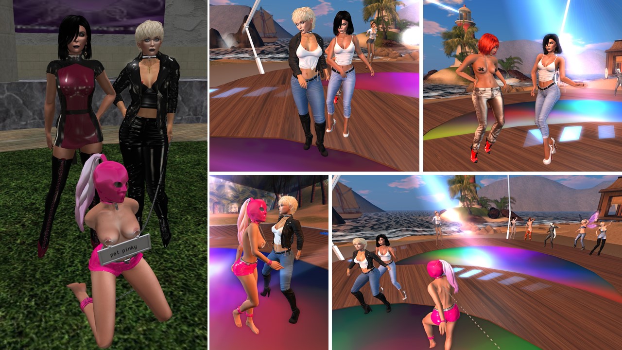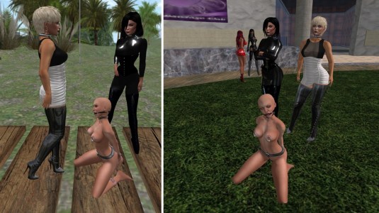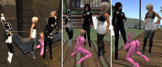 Mistress Jenny and Diomita with slave pet Christa at Mesmerize Dungeon / Diomita with slave Adarra at home at our Stonehaven wall / slave Bella at Psi’s realm
