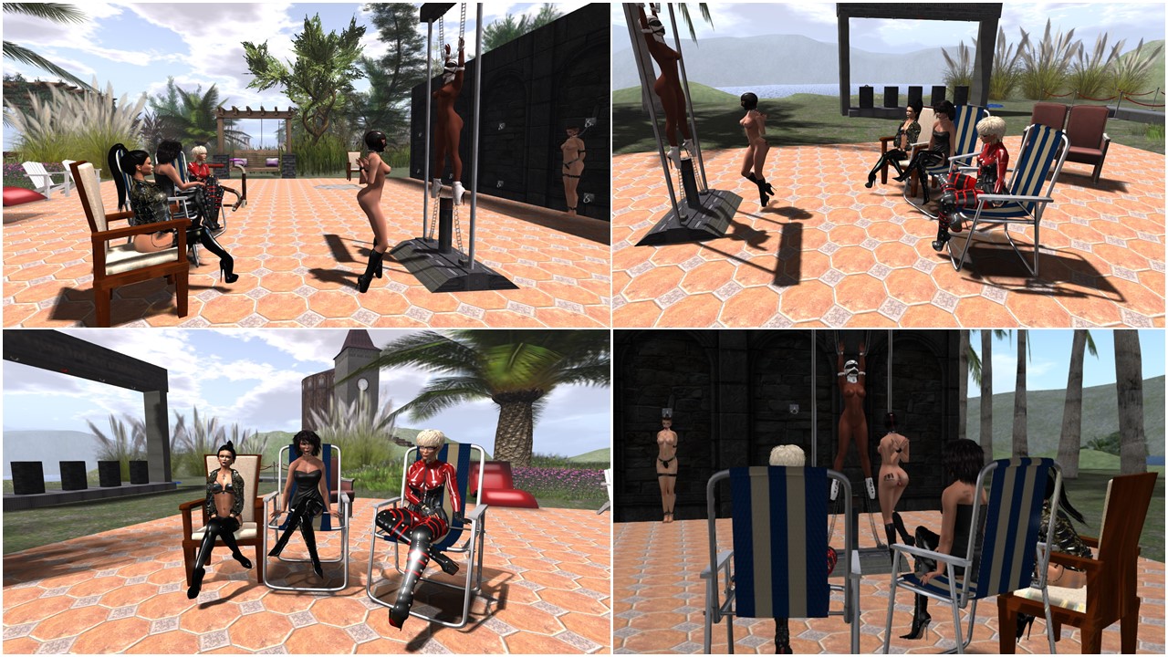Thursday, August 9th, slave Leana and slave kelly were present when I came inworld in the afternoon. I had prepared an extra display box for slave Leana and it one got filled that afternoon finally. Hence the slaves have their very own display box at our porch. left from the main entrance is slave Leana and slave kelly, at the right side is slave Gwen and slave Flo.