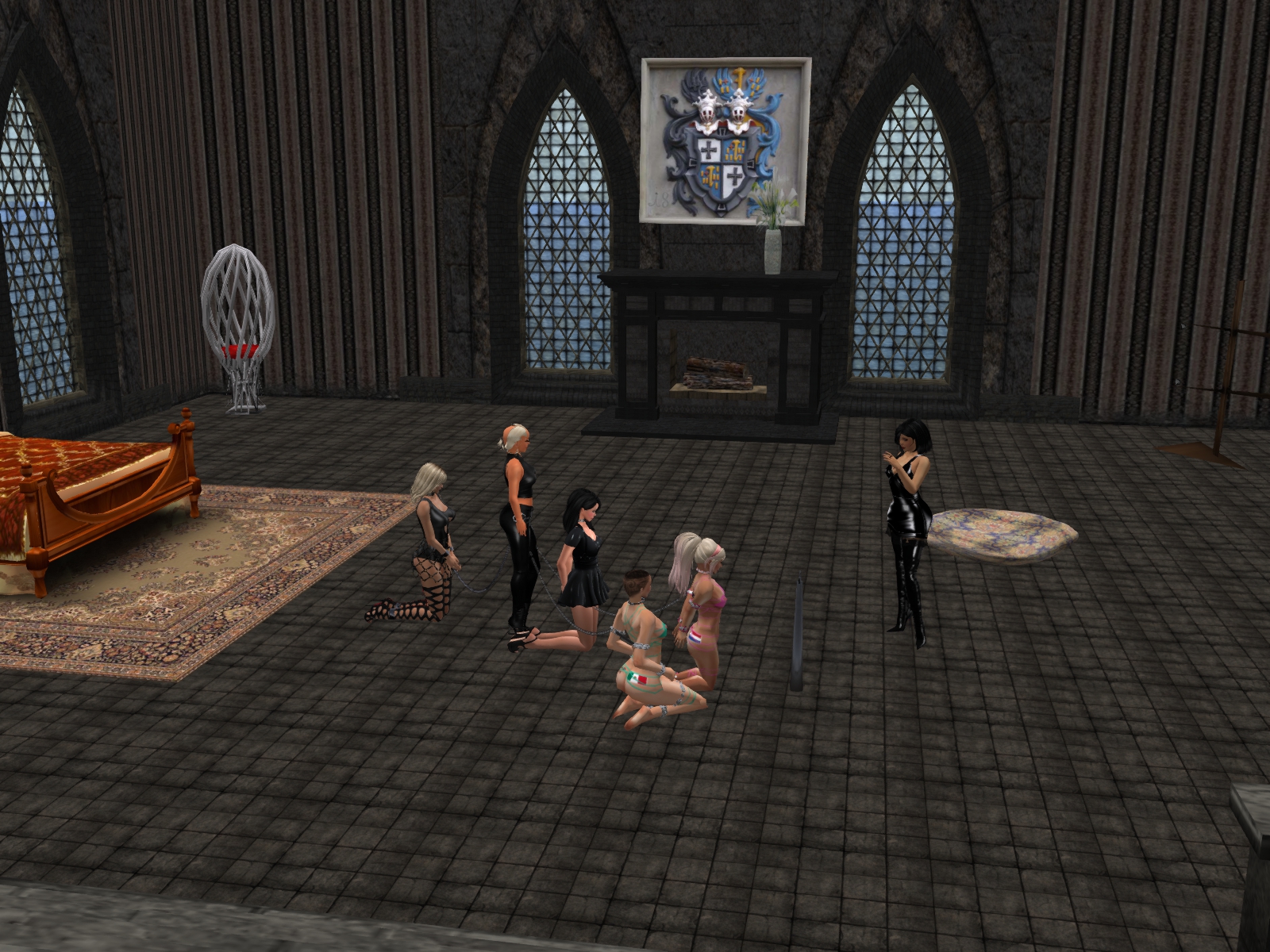 August 4th at MD – a backside view: slave cyan, Mistress Jenny, slave Flo (saying good night), slave pink, Diomita and slave L