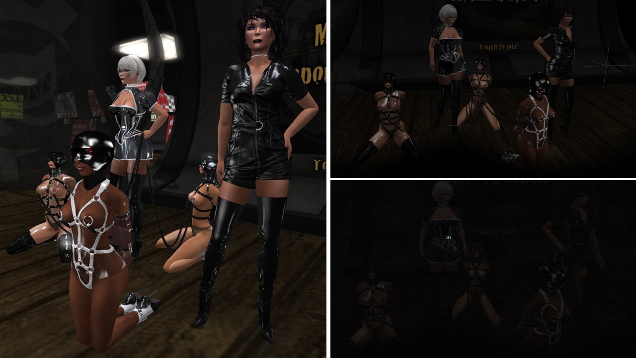 February 19th: Mistress Jenny and Diomita at Heavy Bondage Club with slave Luci / Diomita with slave Gwendi at a shopping event / Diomita with slave Gwendi and slave Lara dancing at Cage Elegance