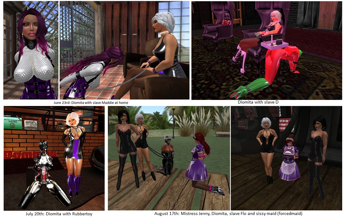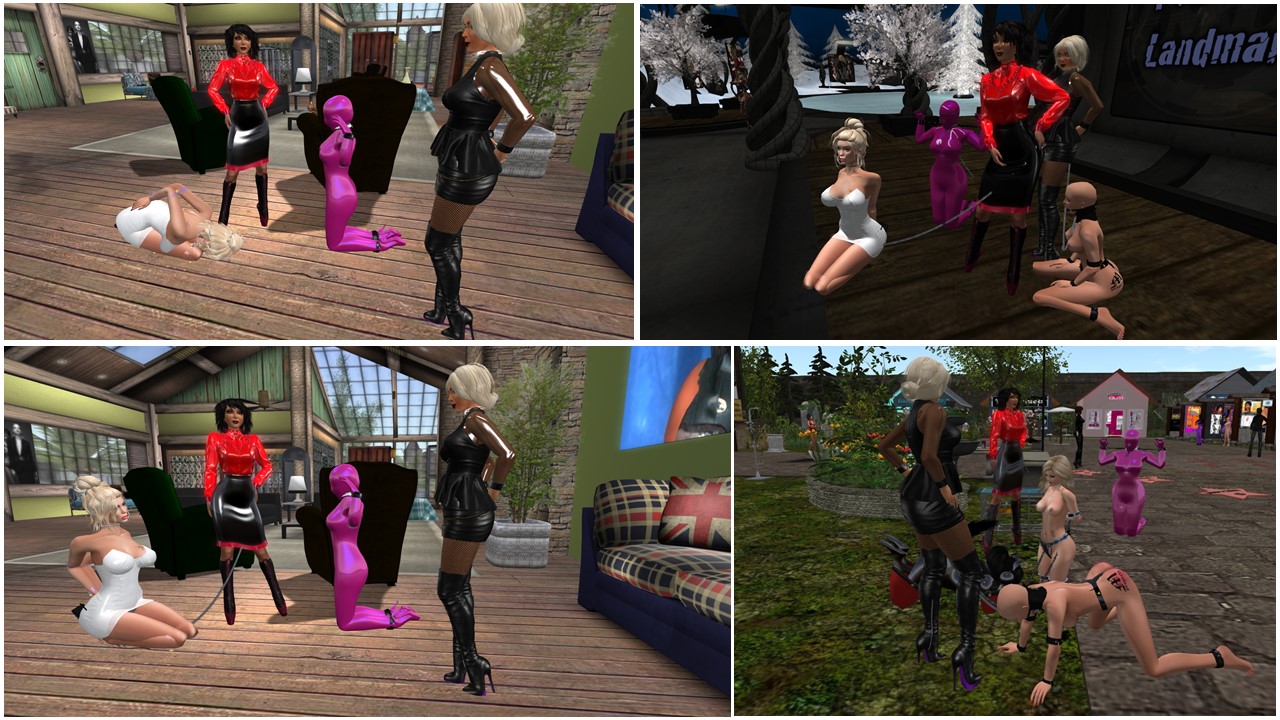 January 10th: Mistress Jenny and Diomita at home with slave Flo and Moon Rouge (Thom2T)(upper and lower left) / at Mesmerize Dungeon with slave Flo, slave kelly and Moon Rouge (upper right) / at Lochme wiht slave puppy Christa, slave Flo, slave kelly and slave Bella