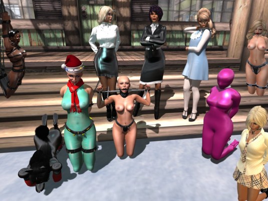 When Mistress Jenny and I came inworld we had a guest at home besides of slave Flo who was cleaning the house. Our guest, Moon Rouge (Thom2T), is a reader of this blog and came inworld to see us. Well she did and Mistress didn’t hesitate to tie her up a bit, leash her and take her with us to Mesmerize Dungeon, where slave kelly joined us. We didn’t stay long at Mesmerize Dungeon and moved to Lochme when slave puppy Christa came inworld as well. And then also slave Bella came inworld. Once again we were quite a group and we took the opportunity to have some entertainment at home with our slaves.