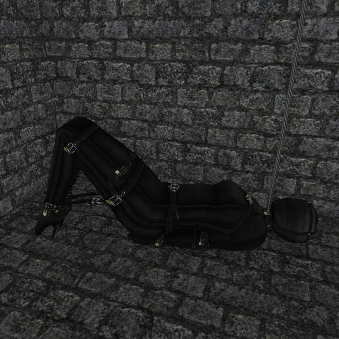 “What was that pet?” the voice asked with a mocking tone. “Yes, I too do believe we should set up the rest of your outfit.” With that Nina’s captor began to tighten straps on the jacket part. With each tightened and buckled up strap Nina became more and more helpless. She could feel freedom slipping away from her, and replaced with an inescapable bondage. Her shoulders protested with pain as an armbinder was applied to her. She was put into an extremely tight-fitting full-length leather skirt, and ballet heels that made walking or standing without assistance impossible.