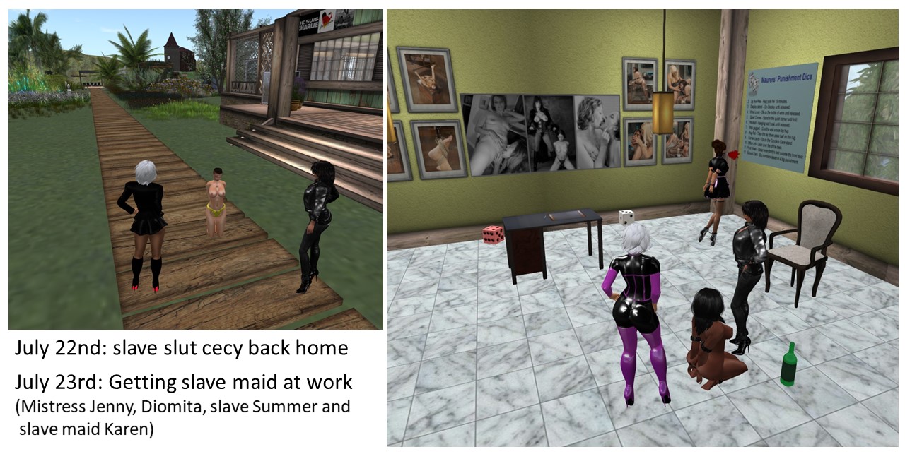 We pursued our kinky Second Life not only within the family. We had several potential slaves and subs around us for a limited time. They left again for different reasons. Nonetheless they added to our fun. I want to mention here: Maddie (madisonrayne02), slave Jade (jadaide,), Summer Robertson (sommerlong), Rubbertoy (Bianca Lamplugh), sissy maid (forcedmaid), ally (ally259) and slave D (scarfdaniela).