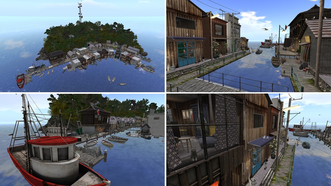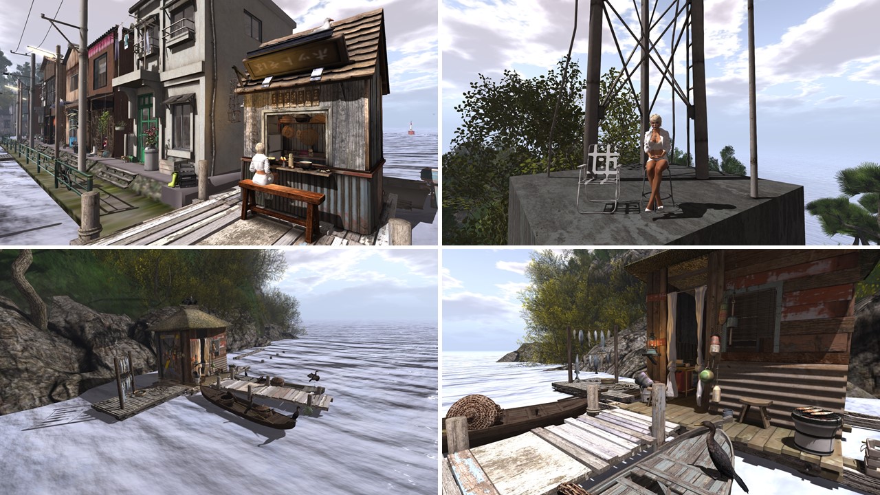 Lately I saw pictures of Tokyo Street on scoop.it SL Destinations several times and I read a bit more about it in some blogs. I learned that Tokyo Street is part of a (moderate) sim created by Paradox Ivory. It’s located on a seperate platform in 2.000m altitude. On the ground level of the same sim is a Japanese costal village named Umi.