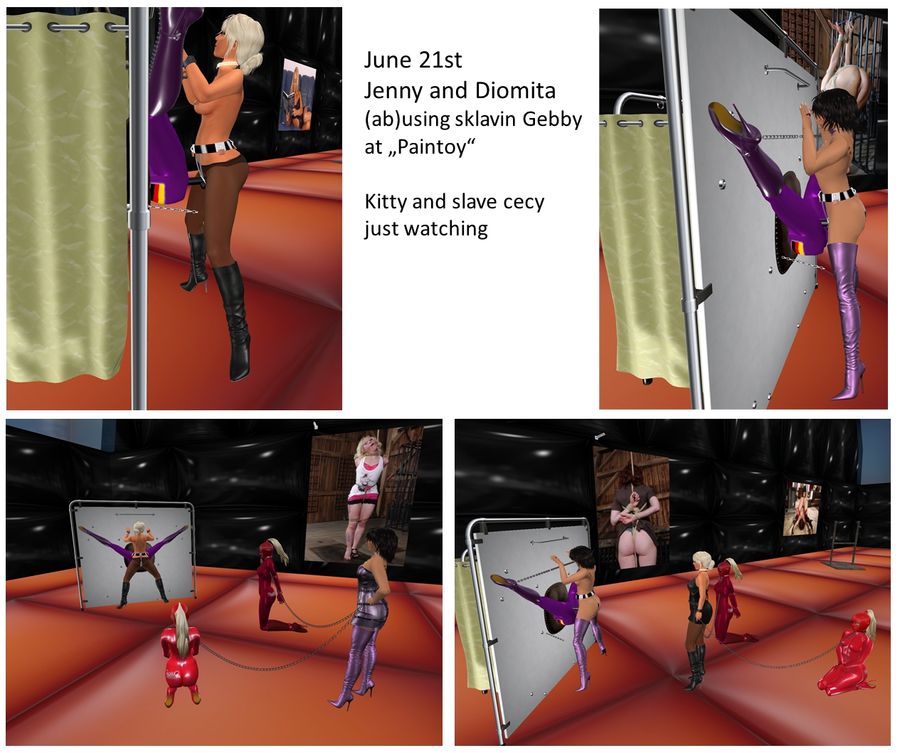 Monday, June 8th, Day 17: Today I took Jenny together with slave Flo to a new location. Well, new at least for me. I got the hint from a friend at The Secret House. It’s another club, connected to a store for clothes and bdsm gear named “Sweet Domination”. What is different is the mixture of guests, males and females and subs of both genders. The clubroom is well equipped with thrones, dance poles, cages and chairs, in one word: something for everybody. And the club is quite full. Nothing is better then a nice crowd to watch. We spent close to an hour at “Sweet Dominantion”, then I brought slave Flo home and my Ehesklavin back to Lochme where I locked her into the Japanese style cage in the main hall of the castle. Yes, it is the same type of cage which we used on May 24th, Day 2.