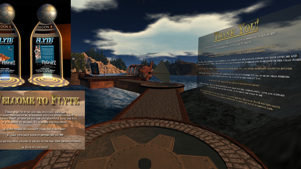 You can reach “FLYTE” either with the direct landmark or from the central landing of SLEA (Second Life Endowment for The Arts).