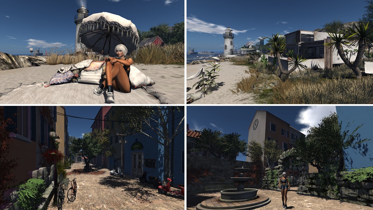 Frogmore is a full moderate region with no sim surround. I kept the windlight that provides a cloudy sky and very blue water. I tried to use shadows but unfortunately it simply affords to many ressources. Loading all textures until they are sharp takes some time already nonetheless. But it was worth it! Frogmore consists of 4 islands which are all connected. It might be a bit tricky to find the way but you don’t need to swim, there are bridges and connections between the islands.