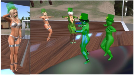 Friday, March 16th, we had our party at night again. I met with Jenny in the afternoon shortly and we went to Domme a Domme to catch up. Jenny was prevented from coming inworld at night due to RL. The party theme was St. Patrick’s day, hence green. I put Angelique into her new chastity belt and bra set and added a green ballgag. The drone slaves Flo I and II were re-coloured to green and we all wore green St. Patrick’s day hats. We had a great party again to embrace the upcoming weekend.