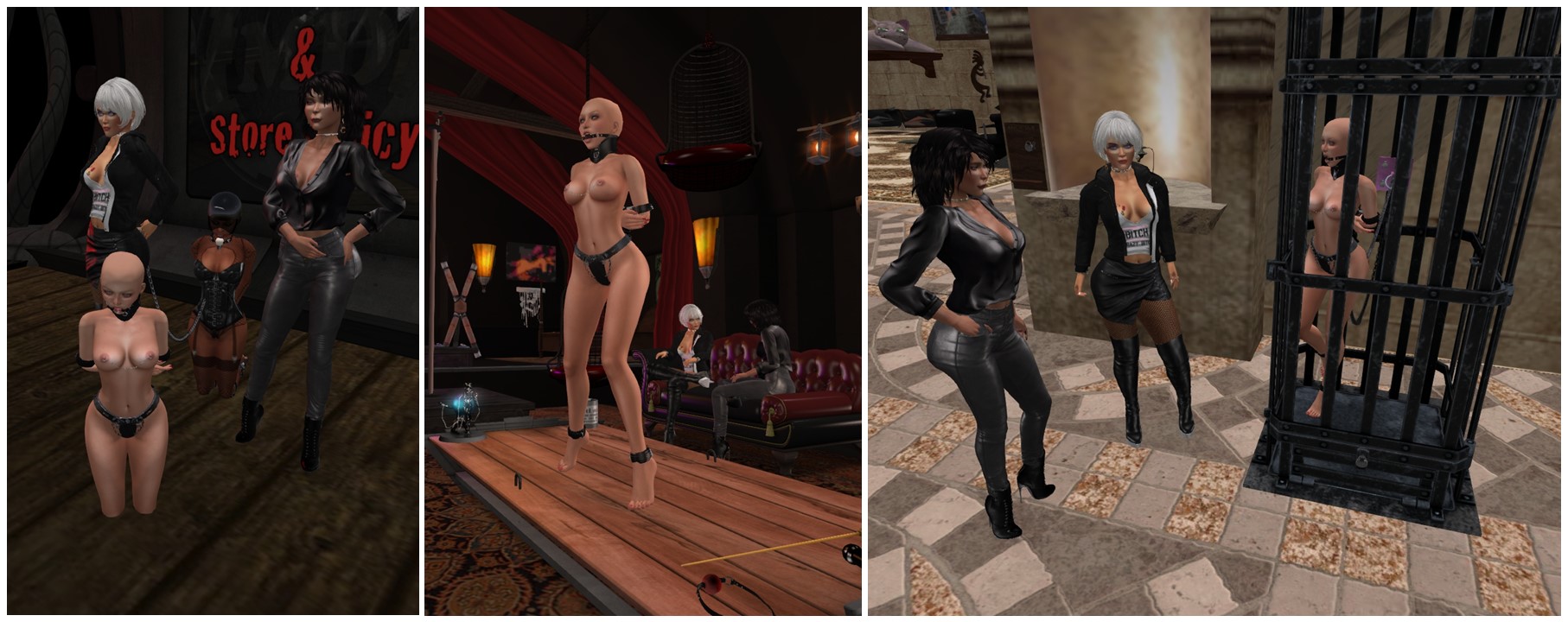 May 2nd: Mistress Jenny and Diomita with slave Flo and slave kelly at Mesmerize Dungeon (left) / slave kelly dancing at club DeLust (middle) / storing slave kelly at Lochme (right)