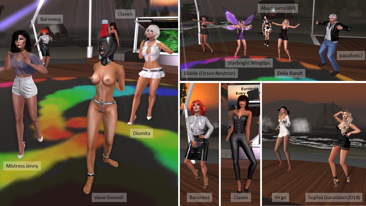 September 6th – Friday night party: Mistress Jenny, Baroness Capelo, Diomita, Claven Albatros, slave Gwendi, Virgo Babii, Sophia (saradawn2018), Diable (Orson Neutron), Alaun (ams684), Starbright Wingtips, Della Randt, papafox57