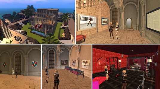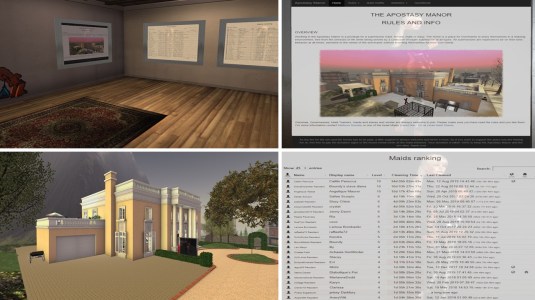 Gone September 6th, 2019 – The Apostasy: sim overview (upper left) / The maids office (lower left) / highly secured home of the rubber slave (upper right) / sim overview with the Bound Maids manor in the foreground (lower right)
