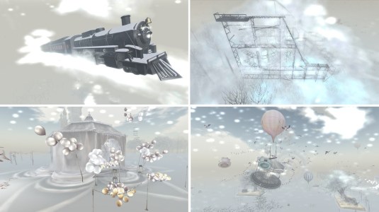 During my journey to the ground level I passed a full train arranged on a cloud (don’t miss it). On the ground level, there’s a lot to discover. You see trees and elements of a fair appear through the fog that mostly covers the ground, through light rays, flying fishes, snow flakes. Some objects are flying, others are on the ground.