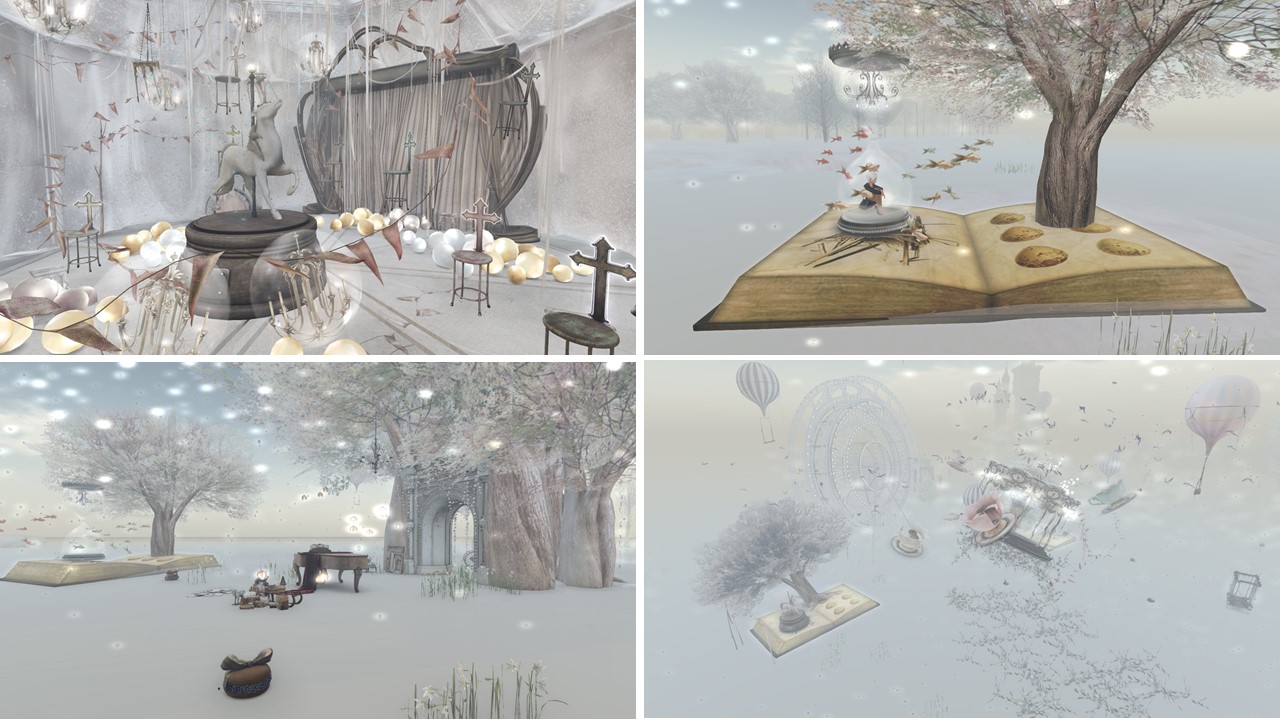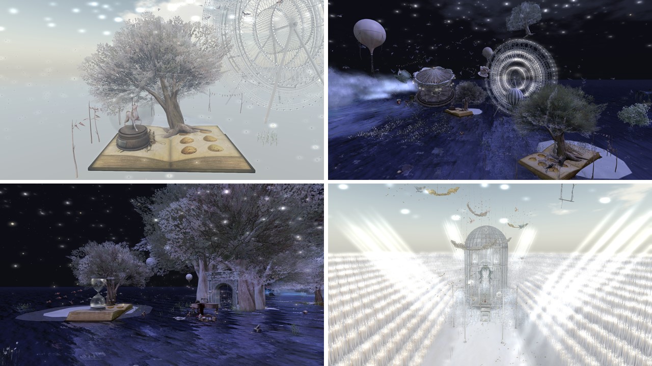 Let me start with my simploring tours about art in Second Life. I admire the creativity of artists in this virtual world, I visited galleries like Lyric Art Gallery, La Masion D’Aneli, 20][21 gallery, Rey’s Gallery, Shui Mo Gallery, Milly Sharple’s Fractal galleries, Daphne.Arts and Deva Westland’s Galerie Des Beaux-Arts. I visited and wrote about 7 installations of Cica Ghost, who continues to conjure a smile in my face with every of her funny whimsical creations. I saw fewer art installations since the Linden Endowment for the Arts (LEA) is on hold. But some private initiatives luckily provide space or the artists themselves dedicate their own space. Just recently I saw an exhibition of Mistero Hifeng’s art at Valium Creek Art Park. I saw “The Mind Melter” by Thoth Jantzen at VeGeTaL PLaNeT, I saw “Lalawood” by Theda Tammas, Yoon (onyxxe), Iono Allen and JadeYu Fhang at La Maison d’Aneli as well as “Binary Radiation” by Nino Vichan. I saw Twilights Doors by Bo Zano (Bozanonl Resident), “The Outer Garden” by bisou Dexler, “Inferno” by Noke Yuitza, “Avaloir” by Eupalinos Ugajin, Undertones by Oluja (artistik Oluja) and “Delicatessen – Tell Me a Story” by Meilo Minotaur.