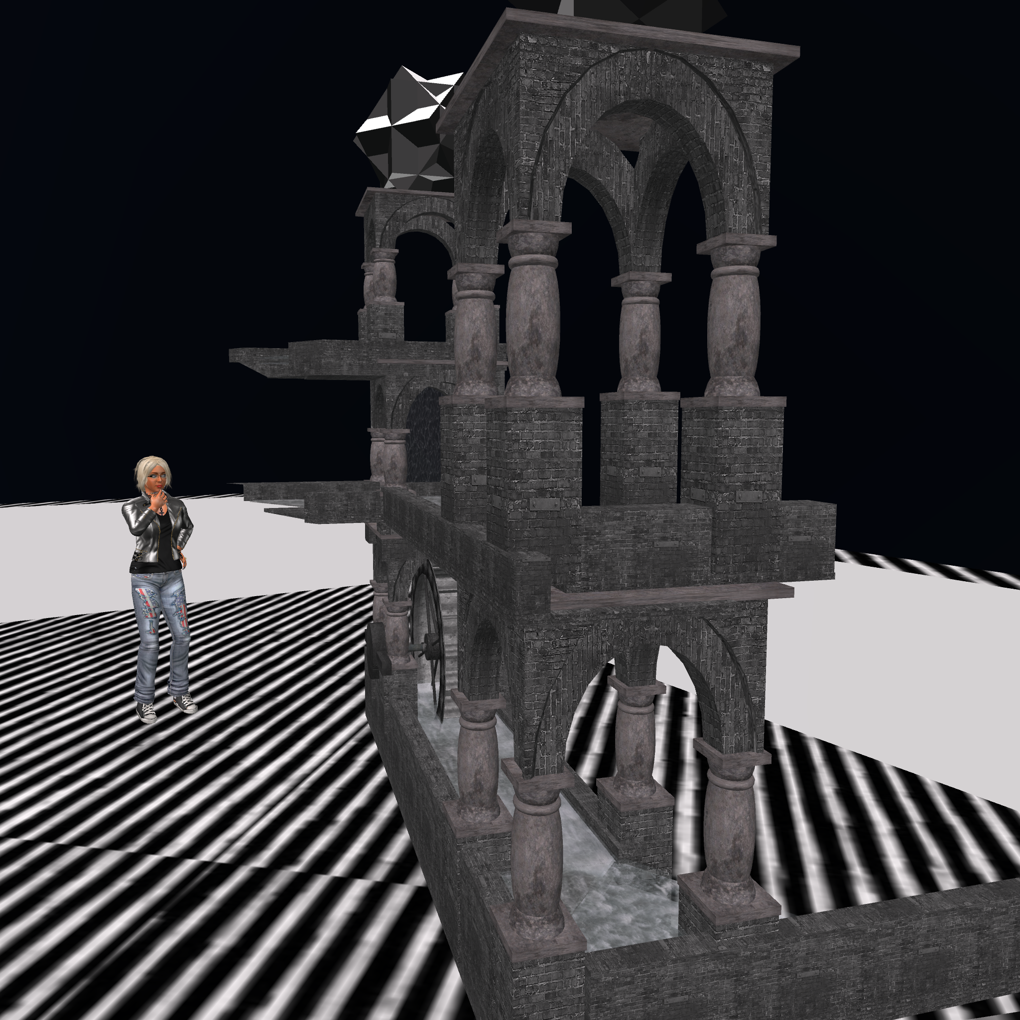 I started my Sunday tour with art (https://modemworld.wordpress.com/2015/03/25/metamorphosis-looking-through-the-eyes-of-escher/). This artful, mostly held in black and white installation by Beq Janus was inspired by M.C. Escher, a Dutch graphic artist, who is famous for his impossible constructions. I recommend reading in Wikipedia about him. Back to SL, where you can walk through virtual art, where you can see it from different angels, in different lights and explore all 3 dimensions. Beq translated Escher’s work into all three dimensions – just as looking with his eyes. Here is the landmark: http://maps.secondlife.com/secondlife/Quarry%20Hill/229/118/4001.