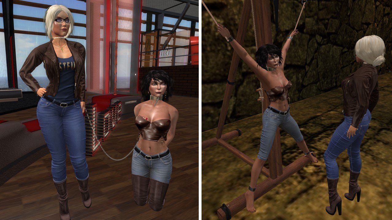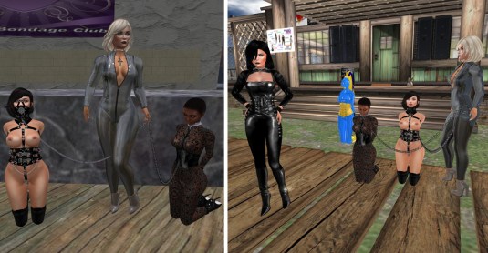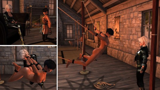 When I returned online Monday afternoon, January 27th, Mistress was waiting for me kneeling in the annex of our skybox. None dared to touch her, she didn’t get into any trouble. We caught up quickly while I dressed, then I took her to the Shibari-house at Caged Elegance (see tomorrow’s simploring report about Caged Elegance). There Mistress had to strip and I fixed her on a bondage rack, I teased her with my fingers, I finger fucked her and made her come before I used her helplessness and licked her to another orgasm to get my fix.