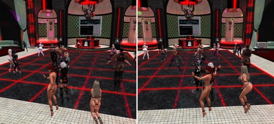 At night I met Angelique again at the skipee table. Flo came by too, we diced to visit a club and to shock people with our twin outfit. We went to club DeLust. With slave Holly, slave Lily (Lily Bloodrose) and Baroness joining us we had kind of a warming up party at club DeLust.