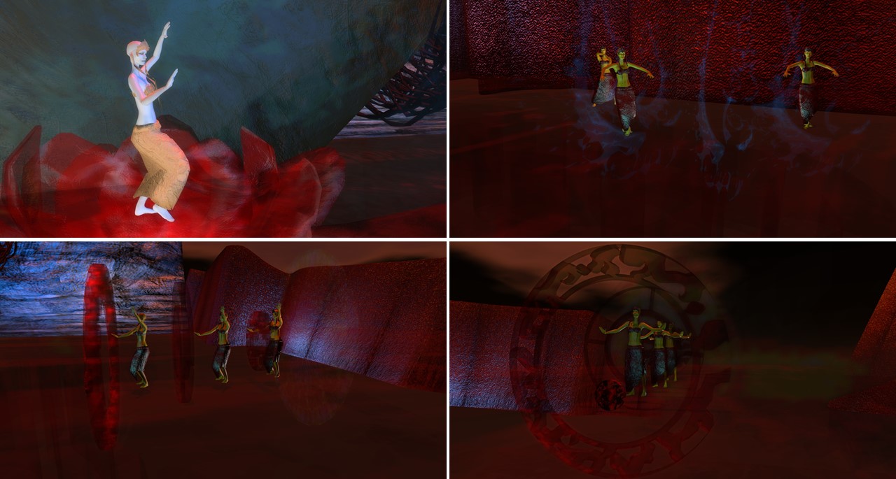 The environment is all in red tones. When you walk behind the wall with the recommended settings you will see the installation. Bascially it is a court surrounded by walls that look a bit like books. At one side is kind of a stage. What you see are dancers. I didn’t count them, I think there’re about 10 dancers. One is performing on the stage and stays there. There are 2 groups with 3 dancers who stay at one spot while dancing. The others move. There is enough motion to keep you busy watching, and enough stability to calm and relax, in particular together with the music: “shamanic drums, deep trance humming meditation, shamanic meditation music for stress relief”
