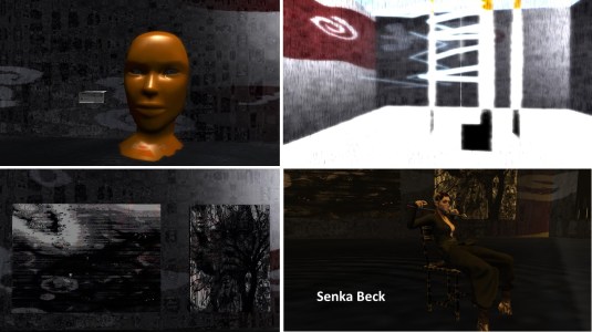 In the upper level the walls are used to display Vitao Theas’ pictures. There are stairs leading up to 2 places where you can sit and watch from there. Another stair leads to a woman with a dog who looks out of a window. And the pictures? A broad variety of pictures taken within Second Life (I think at least) and processed a little bit, either to monochrome or to blurr or to other effects.