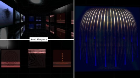 There are permanently changing colourful abstract pictures with different layers, permanently changing and offering a different view every second. On one wall Aneli showcasts almost monochrome structures reminding of minerals or structured surfaces. They look like having 3 dimensions and demonstrate optical illusions.