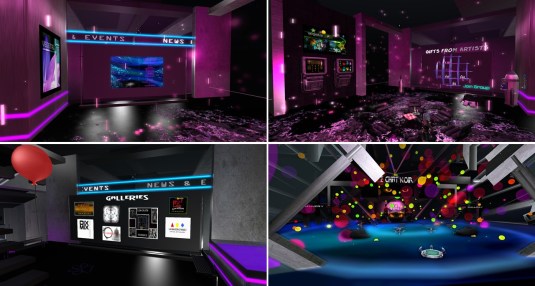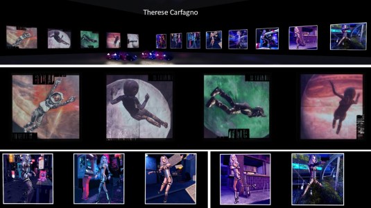 Therese’s skybox is a simple squared room in black with her pictures lined up at the walls. She shows two series of pictures. One is clearly taken in Second Life and shows a young woman dressed in different almost sci-fi outfits in different mostly ubran scenes. All pictures contain a blue light or background. You need to have a closer look to get the details and you can try to create your own story that might combine the pictures. The other series shows an astronaut levitating in zero-gravity above a planet. There are texts or snippets from cards at the edges of the pictures but I couldn’t really connect these to the picture. Maybe you can?