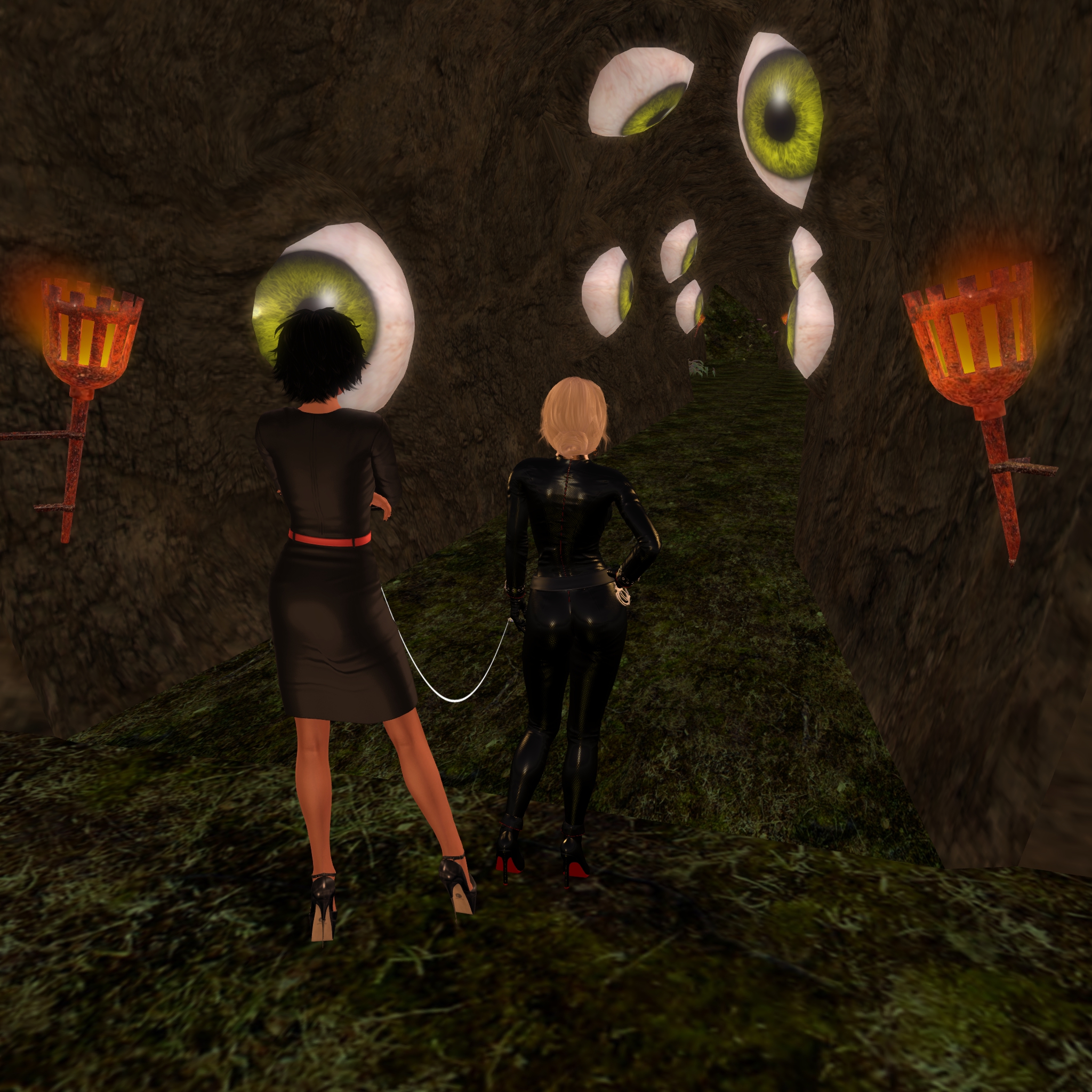 My night became very relaxed and entertaining. I went to club Domme a Domme, made myself confortable in a chair and watched. It’s rare but it happens, there was entertainment in public chat and it was quite amusing. A naked Mistress, hooded with a leather cow mask, wearing a buttplug that sent electric shocks and vibrations every once in a while, was having her way with a sub. She played with the sub’s restraints, tying her up in different poses. She mooooed, which brought her the nickname “Moostriss” and she was calling for others to join the sub. Anyway, it was fun watching.